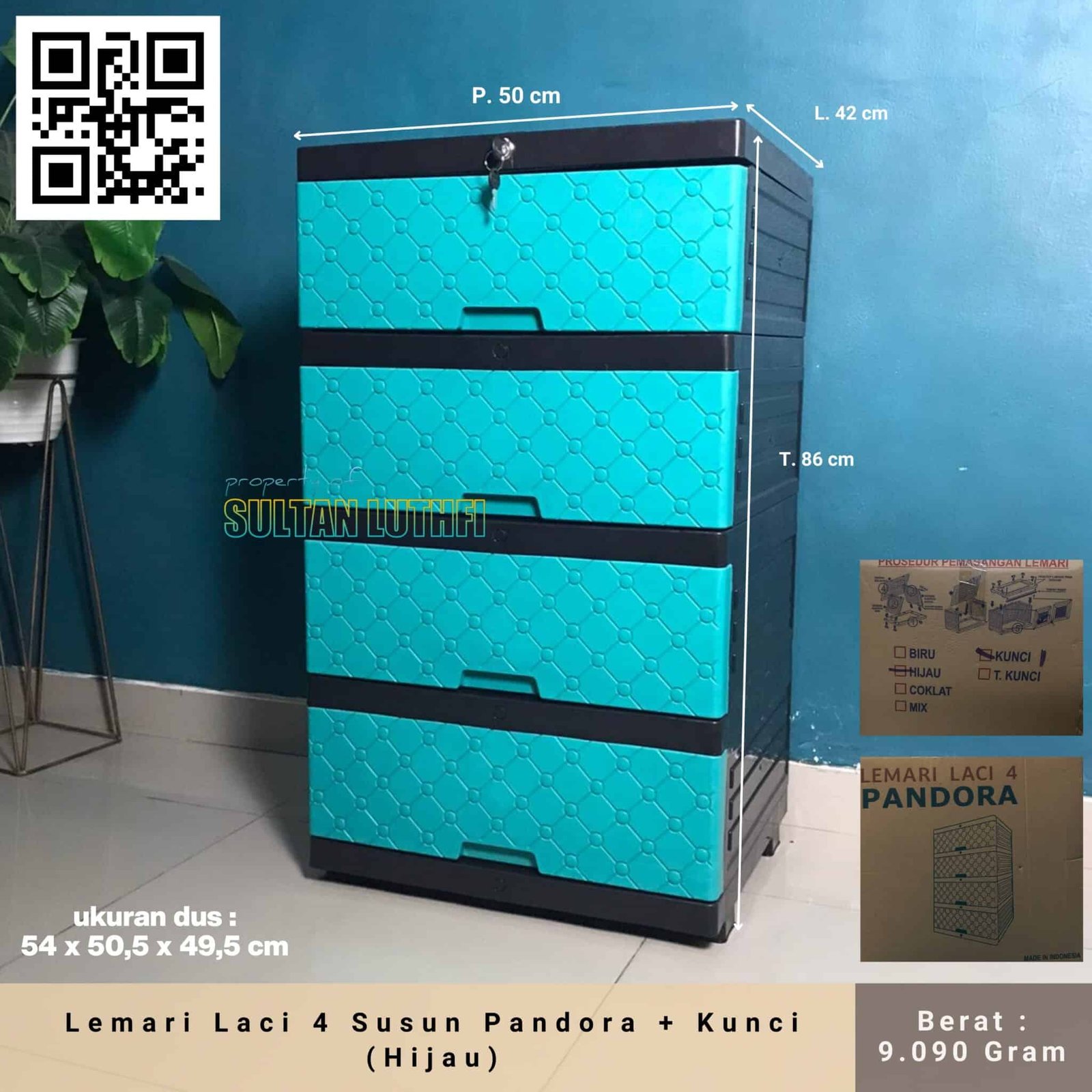 Lemari Laci 4 Susun Pandora + Kunci (Hijau)