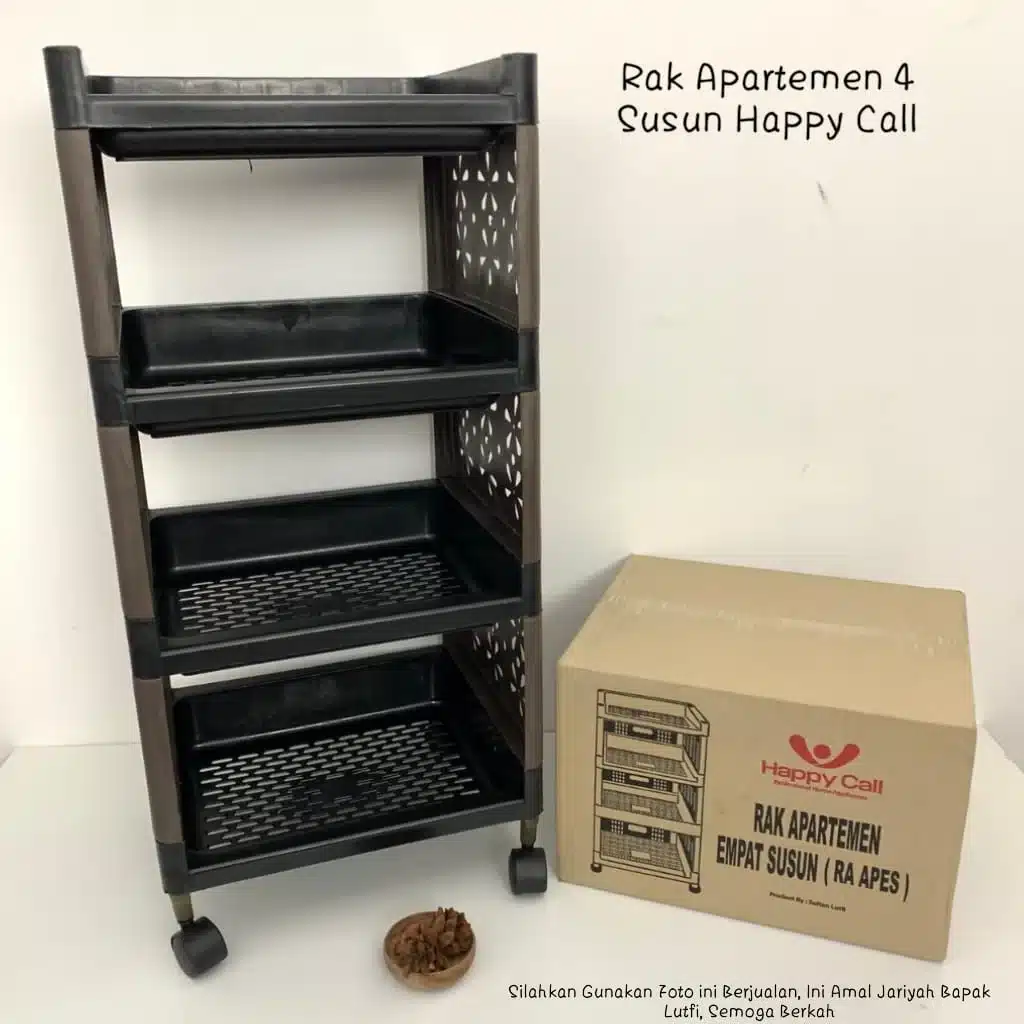 Happy Call, Rak Apartemen 4 susun (kardus aga di besarkan ukurannya), dengan warna hitam yg pas mengisi ruangan anda, disarankan agar lebih kuat di roda bisa ditambahkan lem.