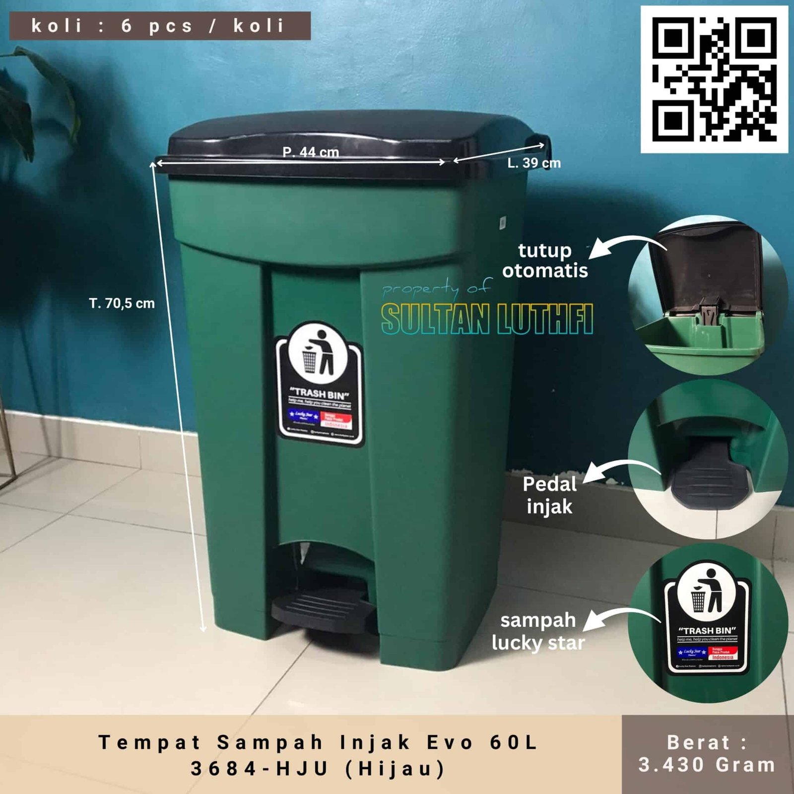 Tempat Sampah Injak 60 Liter Tempat sampah ini memiliki kapasitas besar 60 Liter, sehingga cocok untuk digunakan sebagai tempat sampah dapur atau teras. Dilengkapi dengan pedal untuk memudahkan membuka dan memasukan sampah cukup dengan cara menginjak pedalnya